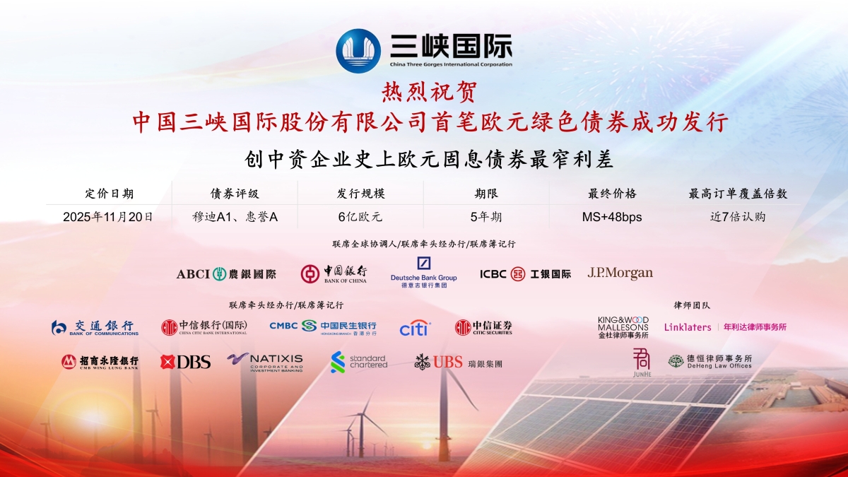 11月20日,三峽國際圓滿完成首次境外債券發(fā)行。本次發(fā)行為6億歐元5年期綠色境外債券,票息2.875%,最終定價MS+48BP,實現(xiàn)近三年中資企業(yè)同年期最低票息和中資企業(yè)歐元債券發(fā)行史上最窄息差,突破央企同年期歐元債券發(fā)行的最大收窄幅度。